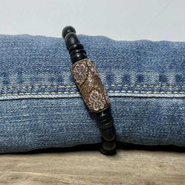 BijouxBien herenarmband met zwarte houten kralen met RVS/vintage accent