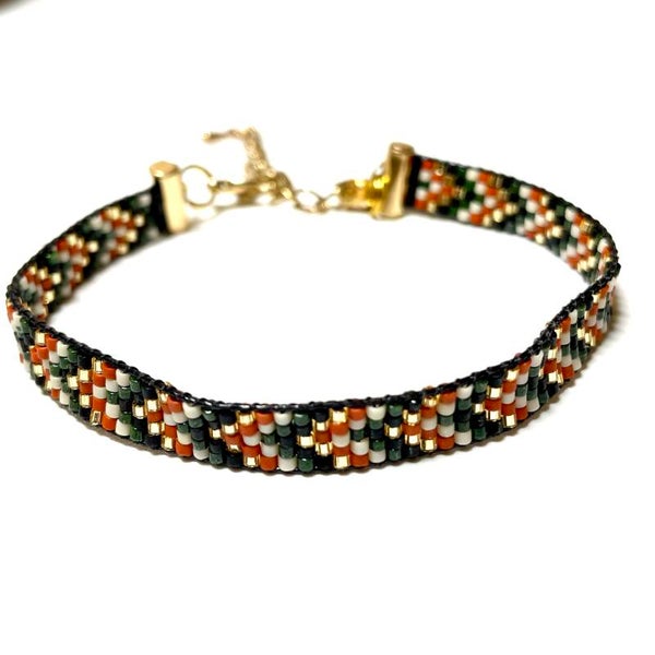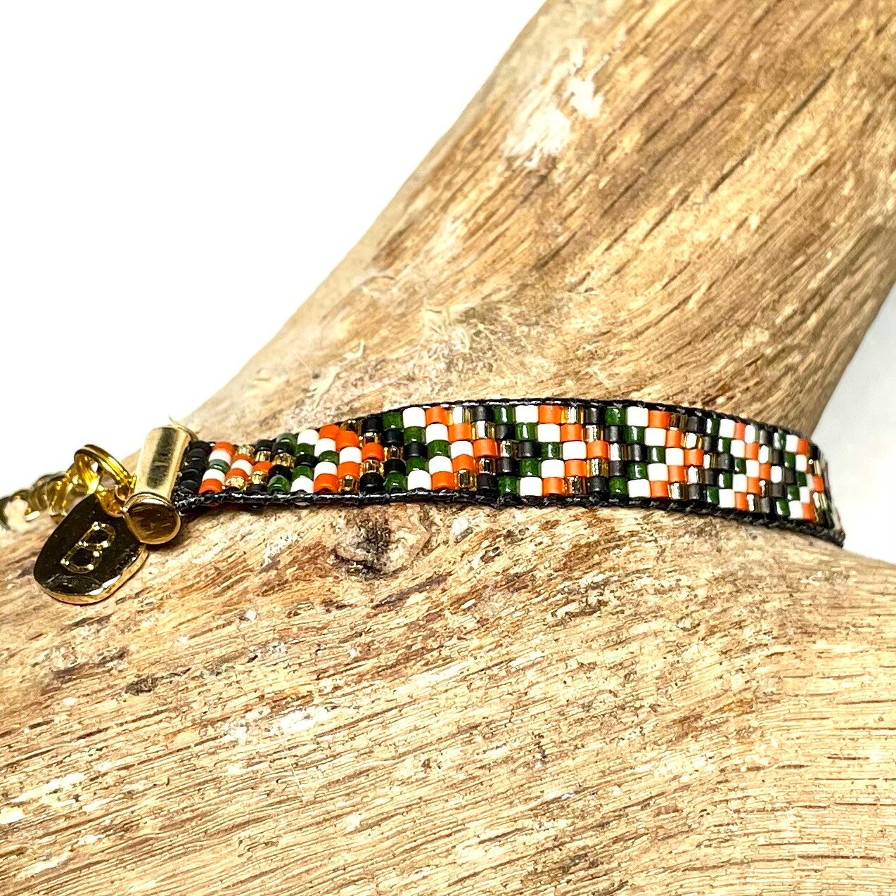 Handgemaakt weefarmbandje van Miyuke kralen in rood/groen/zwart gecombineerd met goudkleurige kraaltjes en verstelbaar slotje.