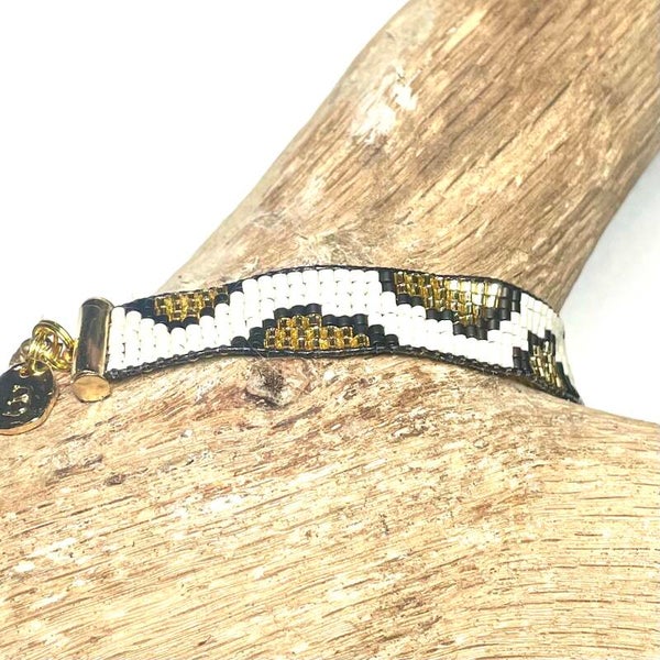 Handgemaakt weefarmbandje van Miyuki kraaltjes met zwart en creme, gecombineerd met goudkleurige kraaltjes en verstelbaar slotje.
