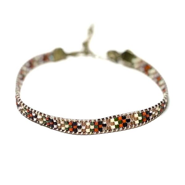 Handgemaakt weefarmbandje van Miyuki kraaltjes met rood/zwart/groen/creme gecombineerd met bronsen verstelbaar slotje.