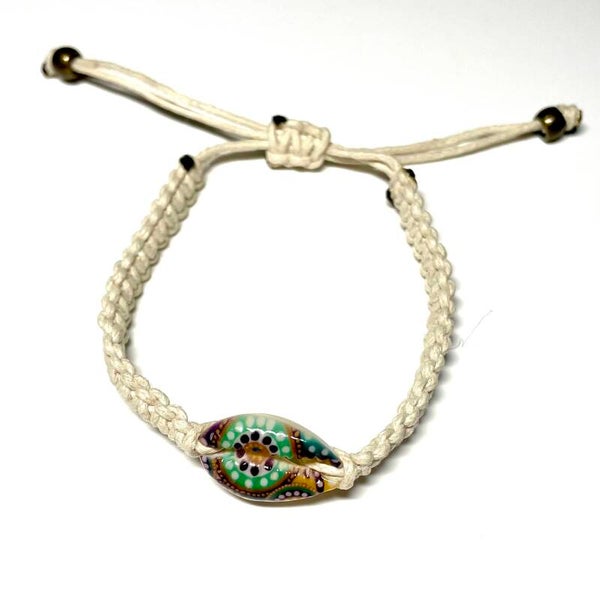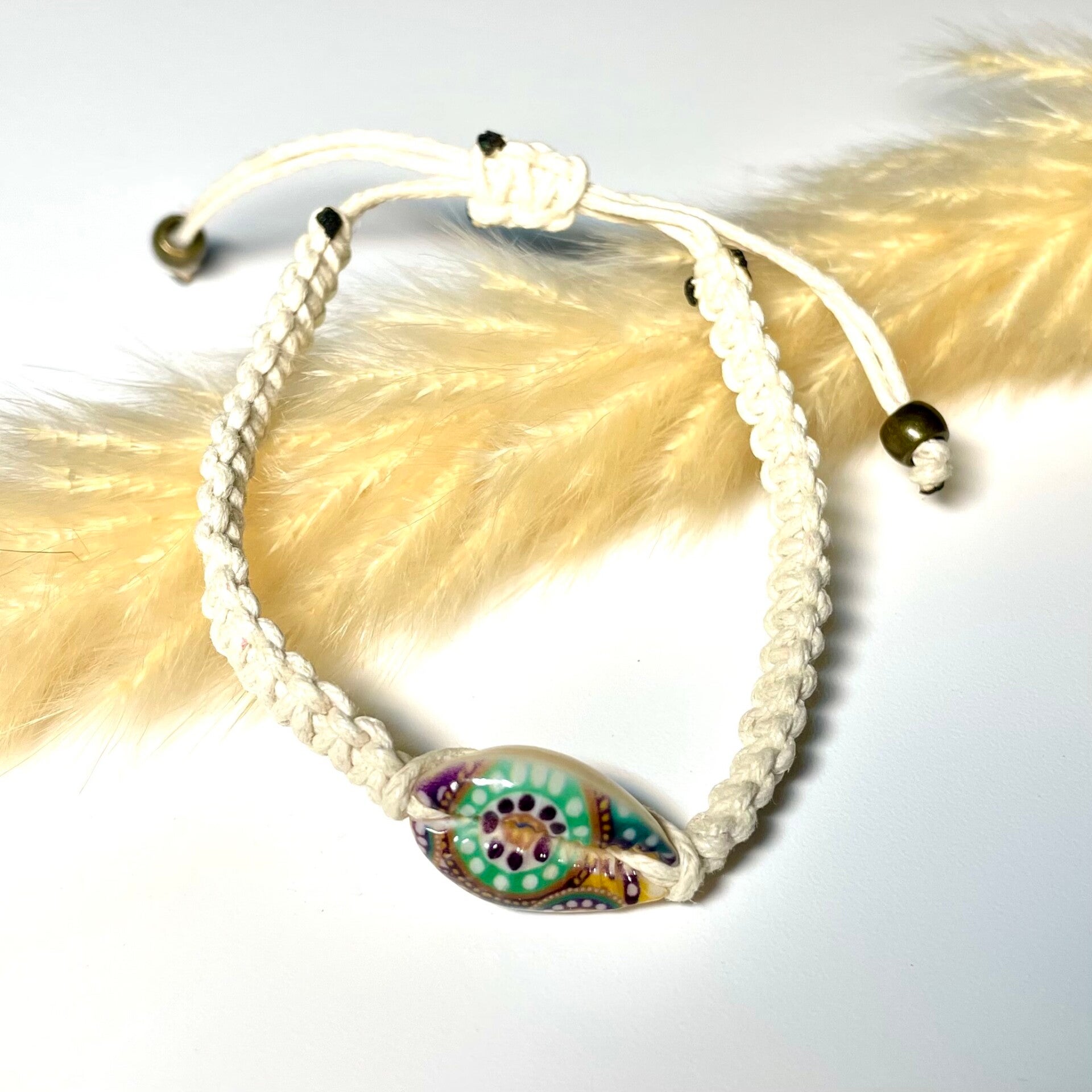 Handgeknoopt armbandje creme van touw met geschilderde schelp.