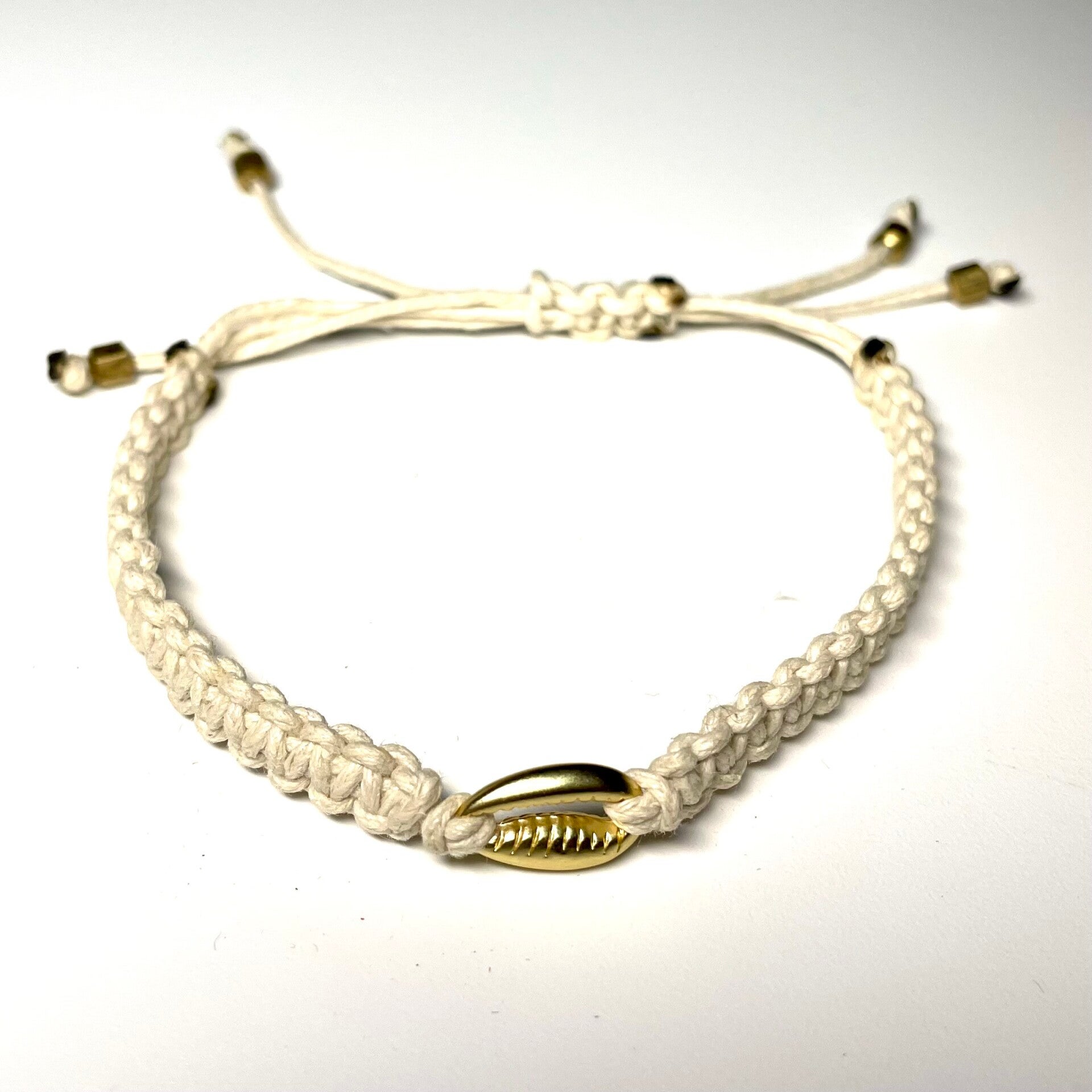 Handgeknoopt armbandje creme van touw met goudkleurig schelpje schelp.