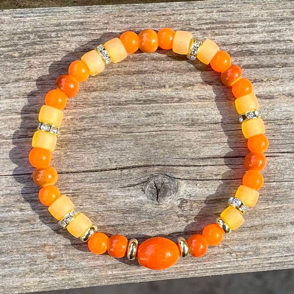 Armbandje met oranje kralen gecombineerd met goudkleurige kralen.