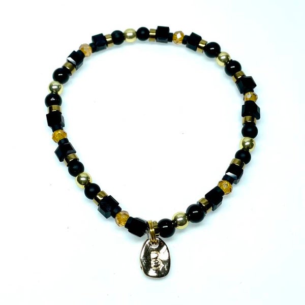 Armbandje met zwarte natuursteen kralen gecombineerd met goudkleurige kralen van hematietsteen en vierkante tusssenkralen.
