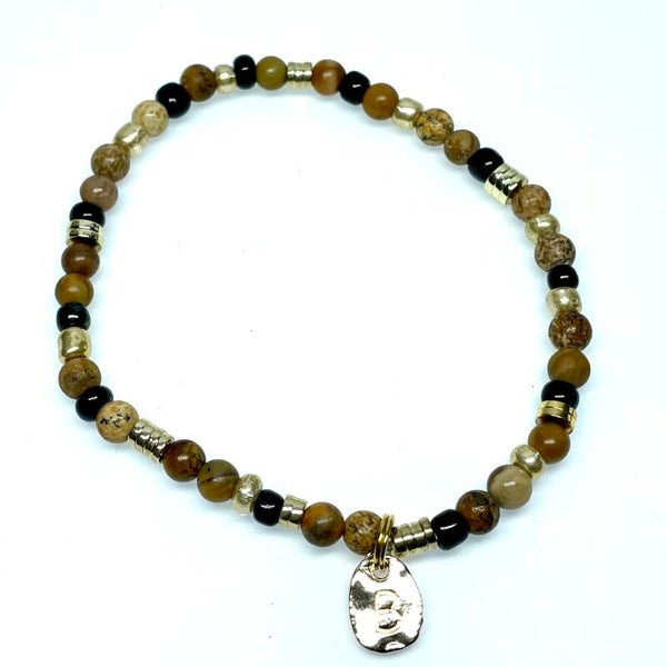 BijouxBien armbandje met bruin/beige en zwarte natuursteen kralen gecombineerd met goudkleurige kralen van hematietsteen